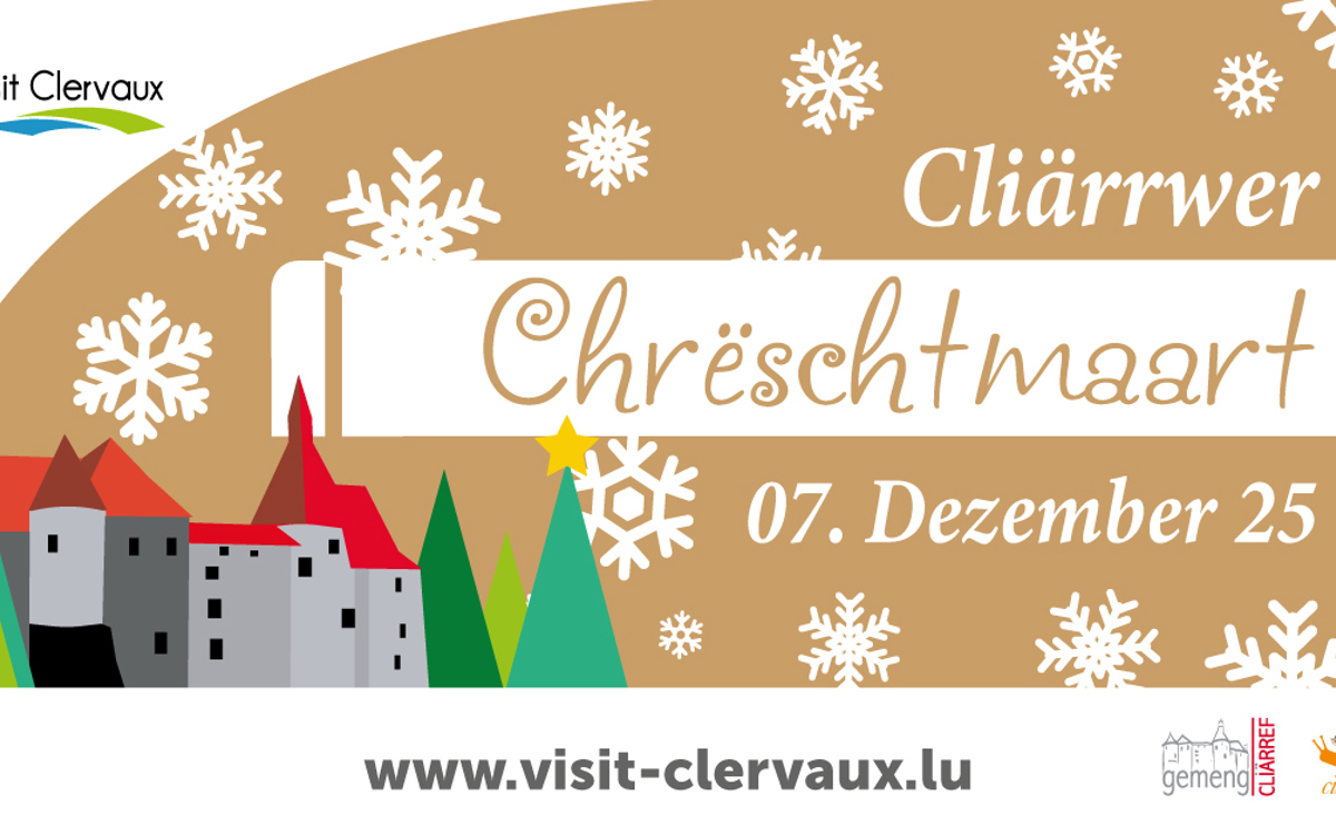 .Venez plonger dans l’atmosphère féerique du Chreschmaart 2025 à Clervaux, le dimanche 7 décembre, de 11h00 à 20h00. La ville se transforme pour l’occasion en un véritable village de Noël où la magie des fêtes s’invite dans la rue commercante et sur la Place du Marché. Laissez-vous séduire par le charme des étals artisanaux, où créateurs et commerçants vous proposent des décorations faites main, des jouets en bois, des gourmandises et des cadeaux uniques pour vos proches.